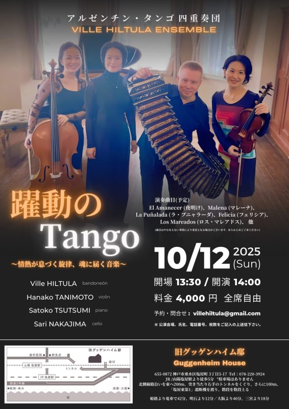 谷本 華子のオフィシャルサイト > コンサート > 10月12日 躍動のTango 10月12日 躍動のTango 2025.10.08 コンサート 神戸・旧グッゲンハイム邸にてタンゴライブです。 まだお席ございます! その他、最新ニュース コンサート 2025.10.27 4月12日&18日 J.S.バッハ 無伴奏ヴァイオリンソナタ&パルティータ全曲演奏会 コンサート 2025.10.27 2月28日 モーツァルト弦楽四重奏曲全曲演奏会 最終回 コンサート 2025.10.27 2026年1月8日 2026ニューイヤーコンサート ニュースカテゴリー お知らせ コンサート ファンクラブ