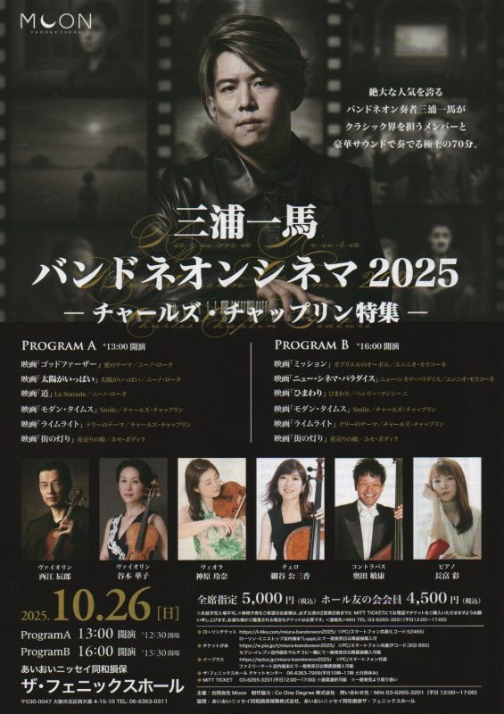 谷本 華子のオフィシャルサイト > コンサート > 10月26日 三浦一馬 バンドネオンシネマ2025 10月26日 三浦一馬 バンドネオンシネマ2025 2025.10.08 コンサート 今年もまた素敵なメンバーとご一緒させていただきます! 今回はチャールズ・チャップリン特集ということで、今からとても楽しみです! まだお席はございますので、どうぞ聴きにいらして下さい! その他、最新ニュース コンサート 2025.10.27 4月12日&18日 J.S.バッハ 無伴奏ヴァイオリンソナタ&パルティータ全曲演奏会 コンサート 2025.10.27 2月28日 モーツァルト弦楽四重奏曲全曲演奏会 最終回 コンサート 2025.10.27 2026年1月8日 2026ニューイヤーコンサート ニュースカテゴリー お知らせ コンサート ファンクラブ