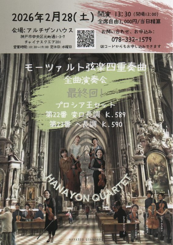 谷本 華子のオフィシャルサイト > コンサート > 2月28日 モーツァルト弦楽四重奏曲全曲演奏会 最終回 2月28日 モーツァルト弦楽四重奏曲全曲演奏会 最終回 2025.10.27 コンサート いよいよ23曲完走です! ここまで長い年月が要しましたが、一つの目標を果たせることを自信にも成長にも繋がるような気がします。 モーツァルトの弦楽四重奏団曲、最後の2曲、皆さまにも聴いていただきたいです! その他、最新ニュース NEW コンサート 2025.10.27 4月12日&18日 J.S.バッハ 無伴奏ヴァイオリンソナタ&パルティータ全曲演奏会 NEW コンサート 2025.10.27 2月28日 モーツァルト弦楽四重奏曲全曲演奏会 最終回 NEW コンサート 2025.10.27 2026年1月8日 2026ニューイヤーコンサート ニュースカテゴリー お知らせ コンサート ファンクラブ