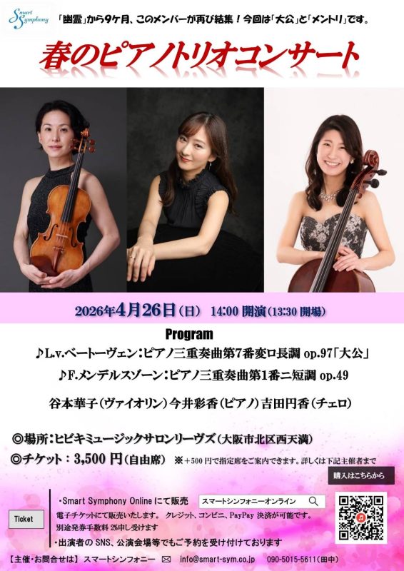 谷本 華子のオフィシャルサイト > コンサート > 4月26日 春のピアノトリオコンサート 4月26日 春のピアノトリオコンサート 2026.02.01 コンサート 素敵な方々と共演! 前回のベートーヴェンのゴーストトリオで意気投合し、またご一緒させていただける事になりました。 プログラムは王道のベートーヴェン「大公」とメンデルスゾーン第一番。 楽しみです! その他、最新ニュース NEW コンサート 2026.02.01 3月21日 春の息吹と情熱の音 NEW コンサート 2026.02.01 4月26日 春のピアノトリオコンサート NEW コンサート 2026.02.01 2月11日 いずみシンフォニエッタ大阪 第55回定期演奏会 ニュースカテゴリー お知らせ コンサート ファンクラブ